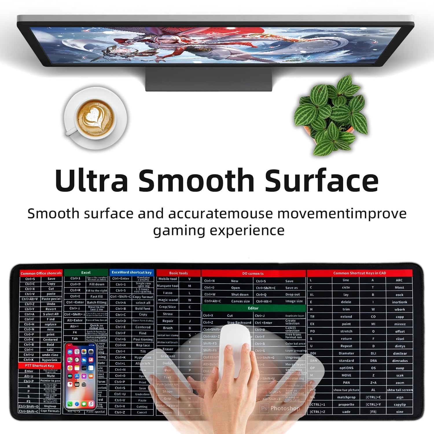CUBIZ Anti-Slip Keyboard Pad with Office Software Shortcuts Pattern, Clear Extended Large Cheat Sheet Mouse Pad, Large Rubber Base Mice Smooth Cloth Desk Mat, Excel Shortcut Keys Mouse Pad (80x30cm)