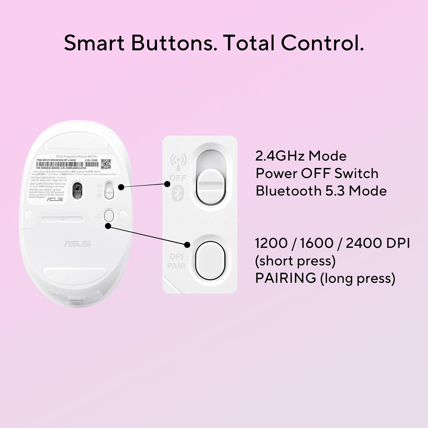 ASUS MD101 Silent Fragrance Mouse, Upto 2400 DPI, Pair Up to 2 Device, Ergonomic Wireless Right Handed Optical Mouse with Bluetooth (2.4GHz Wireless, Bluetooth, Iridescent White)