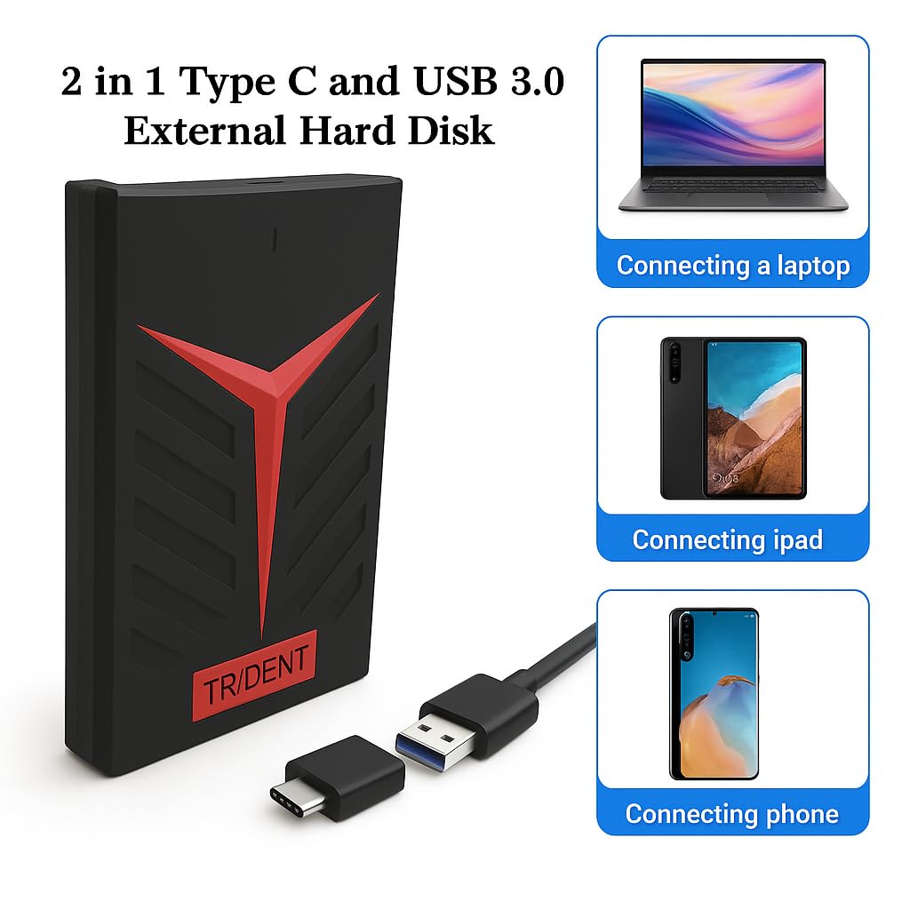 Trident 500 GB Hi-Speed Portable Hard Drive, Type-C and USB 3.0, 2-in-1 Mobile and PC Compatible, Heavy Duty Ultra Slim HDD, 2 Yrs Warranty (Trident, 500 GB)