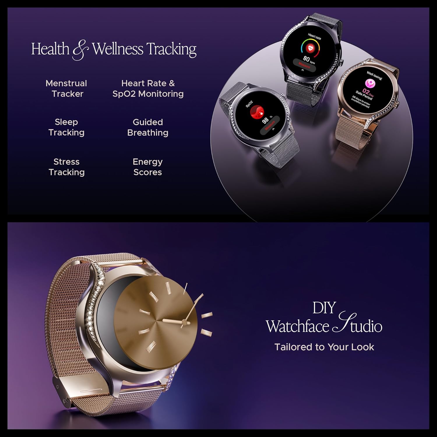 boAt Enigma Gem Womens Luxury Smart Watch w/ 1.19 (3.02cm) AMOLED Display, Emergency SOS Live Location Sharing, Watch Face Studio, QR Tray, BT Calling, 700+Active Mode, HR & SpO2 (Rose Gold)