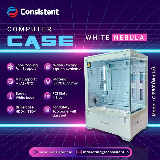 Consistent PC Case (CIP501) White Nebula Computer Case | Gaming Cabinet - White | Support ATX, M-ATX, ITX | Infinity Mirror Pre- Installed 3 x 120mm Front and 1 x 120mm Rear ARGB Fans