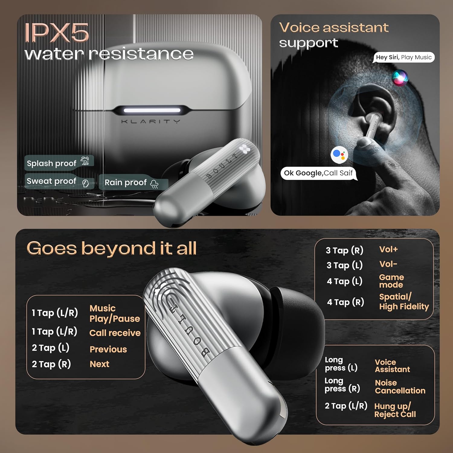 GOBOULT Klarity 3 6-Mic Hybrid ANC Upto 50dB in Ear Earbuds, Spatial Audio, Dual Device Pairing, 50H Playtime, Wind Noise Reduction 6 Mic Calling, Type-C Fast Charging, 13mm Bass Driver TWS (Grey)